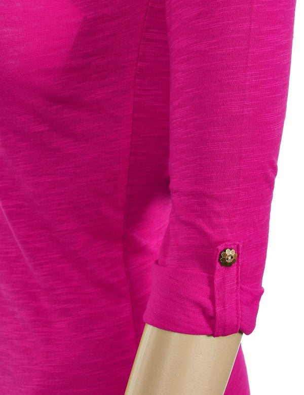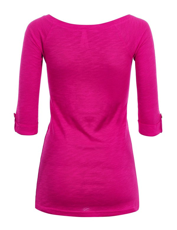 Casual 3/4 sleeve top with crochet lace detail on V-neck - Fitted, does run a tad small, sizing up recommended.