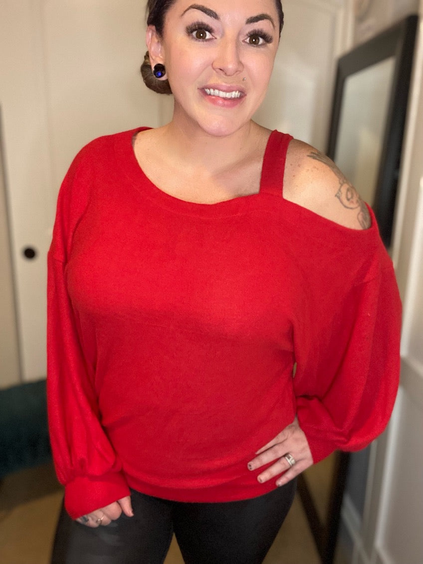 Solid Hacci Brush Single Cutout Cold Shoulder Basic Casual Knit Top with Balloon Sleeves. Super soft and true to size relaxed fit.