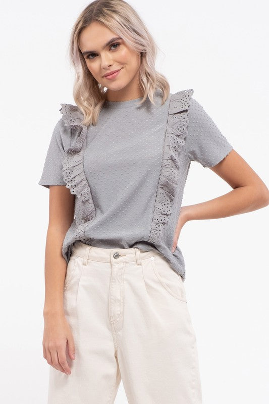 - SWISS DOT KNIT TOP- CREW NECKLINE- SHORT SLEEVE- CONTRAST COTTON EYELET LACE RUFFLE