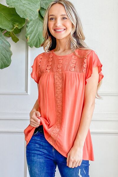 This Lace Detail Ruffle Short Sleeve Blouse is a charming and elegant addition to your wardrobe. The lace detailing adds a touch of sophistication to the classic short-sleeved blouse silhouette. With ruffle accents, this blouse exudes a feminine and romantic vibe. The versatile design allows you to dress it up for a special occasion or wear it casually for a chic everyday look. Made with lightweight and breathable fabric, it is comfortable to wear all day long. Elevate your style with this beautiful blouse that will effortlessly transition from day to night with ease.