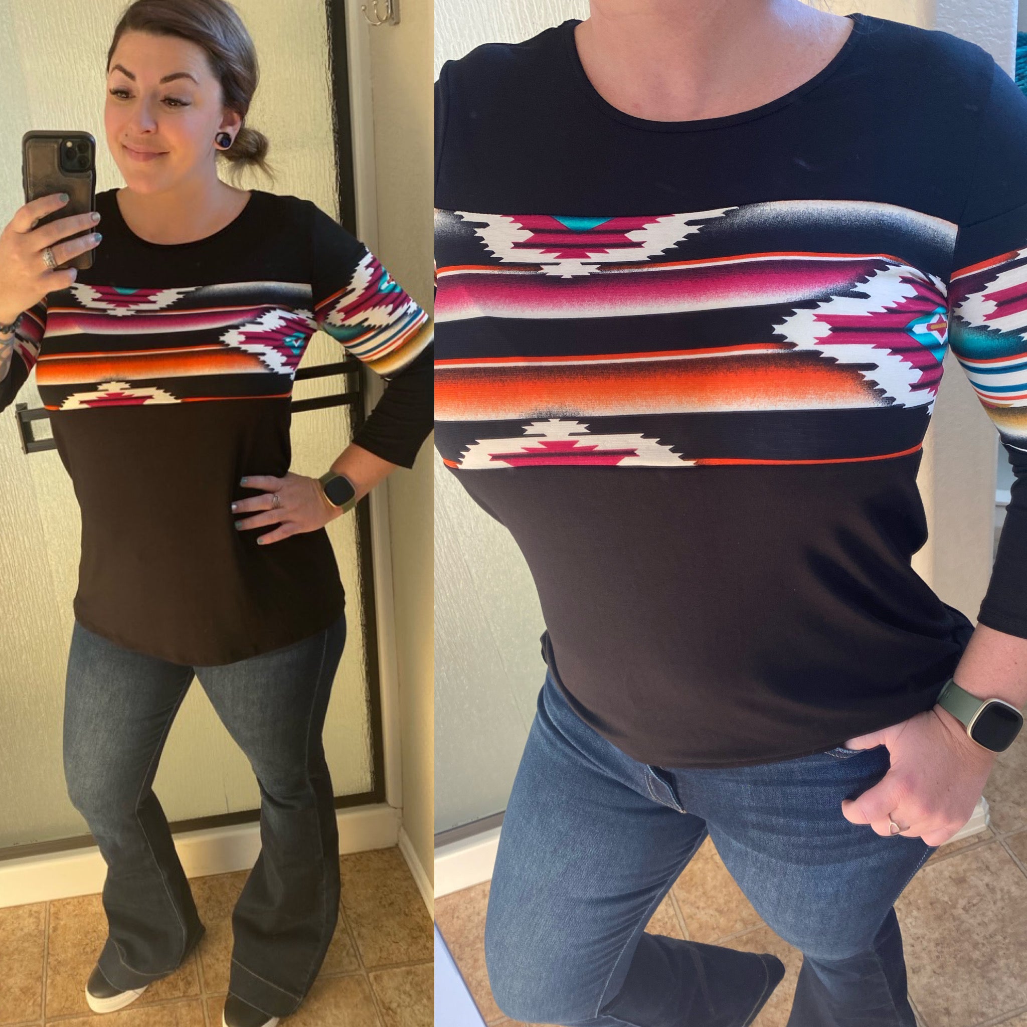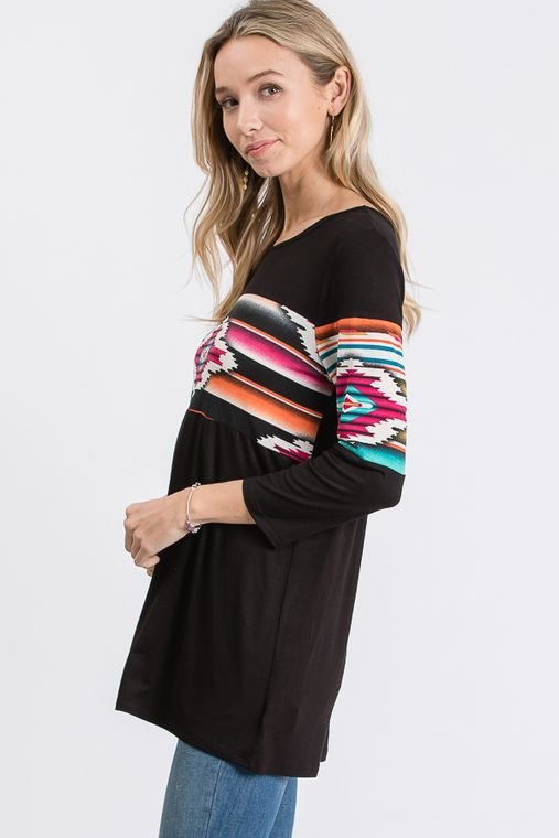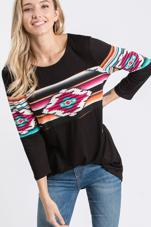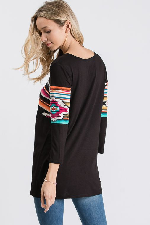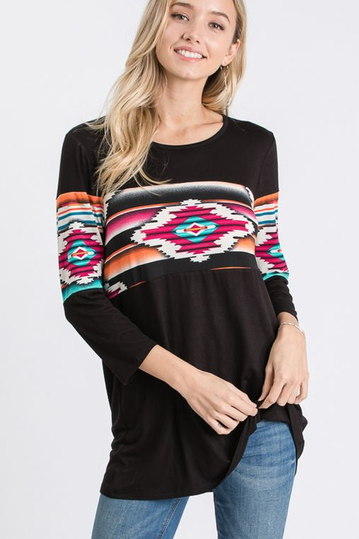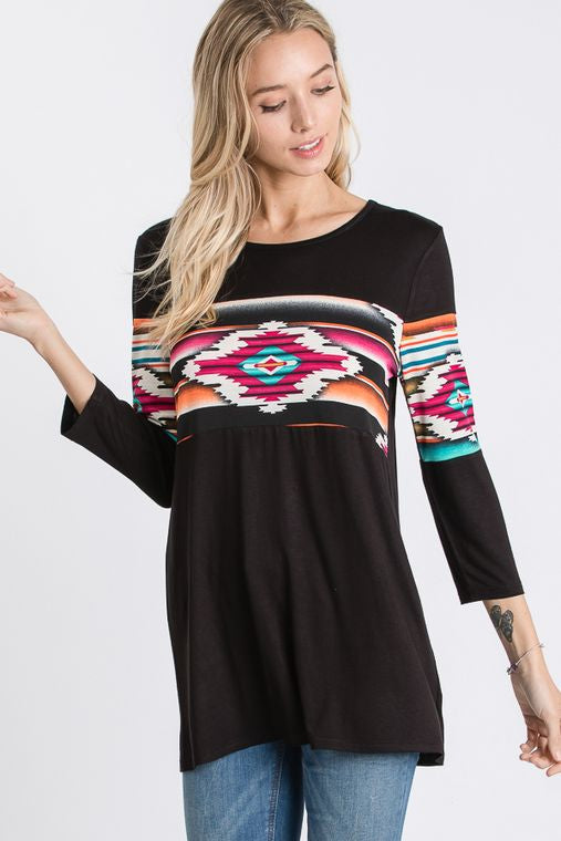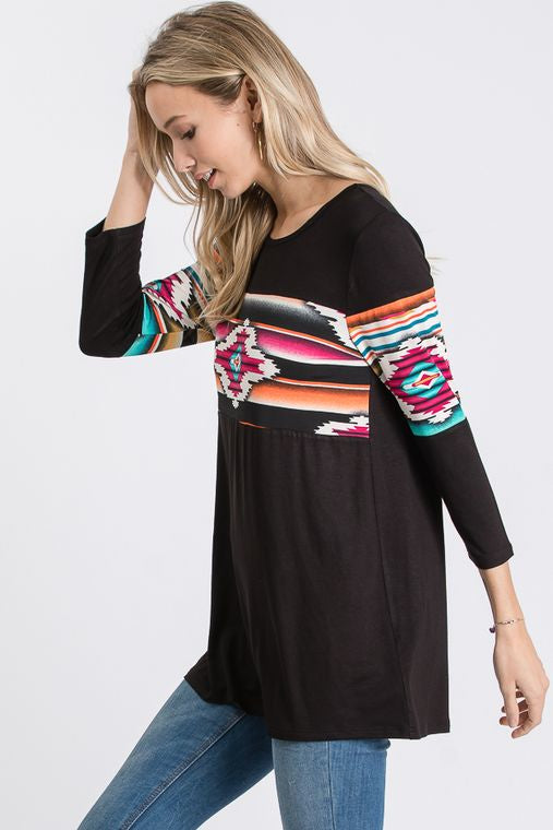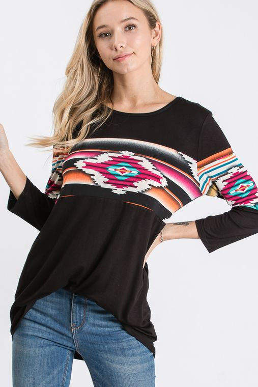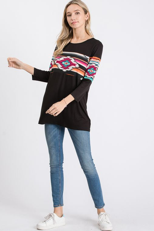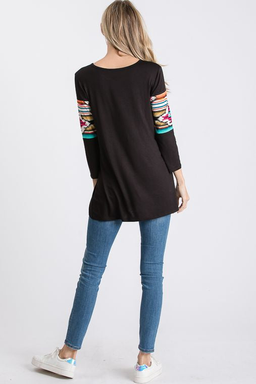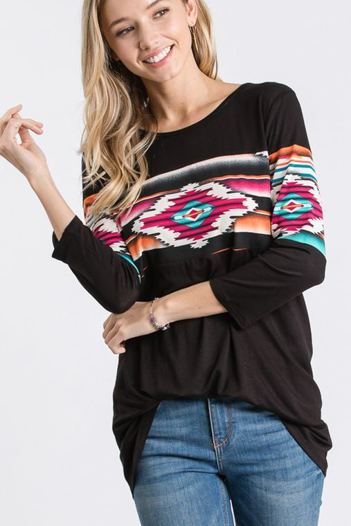 THREE QUARTER SLEEVE ROUND NECK SOLID AND AZTEC PRINT CONTRAST TOP
